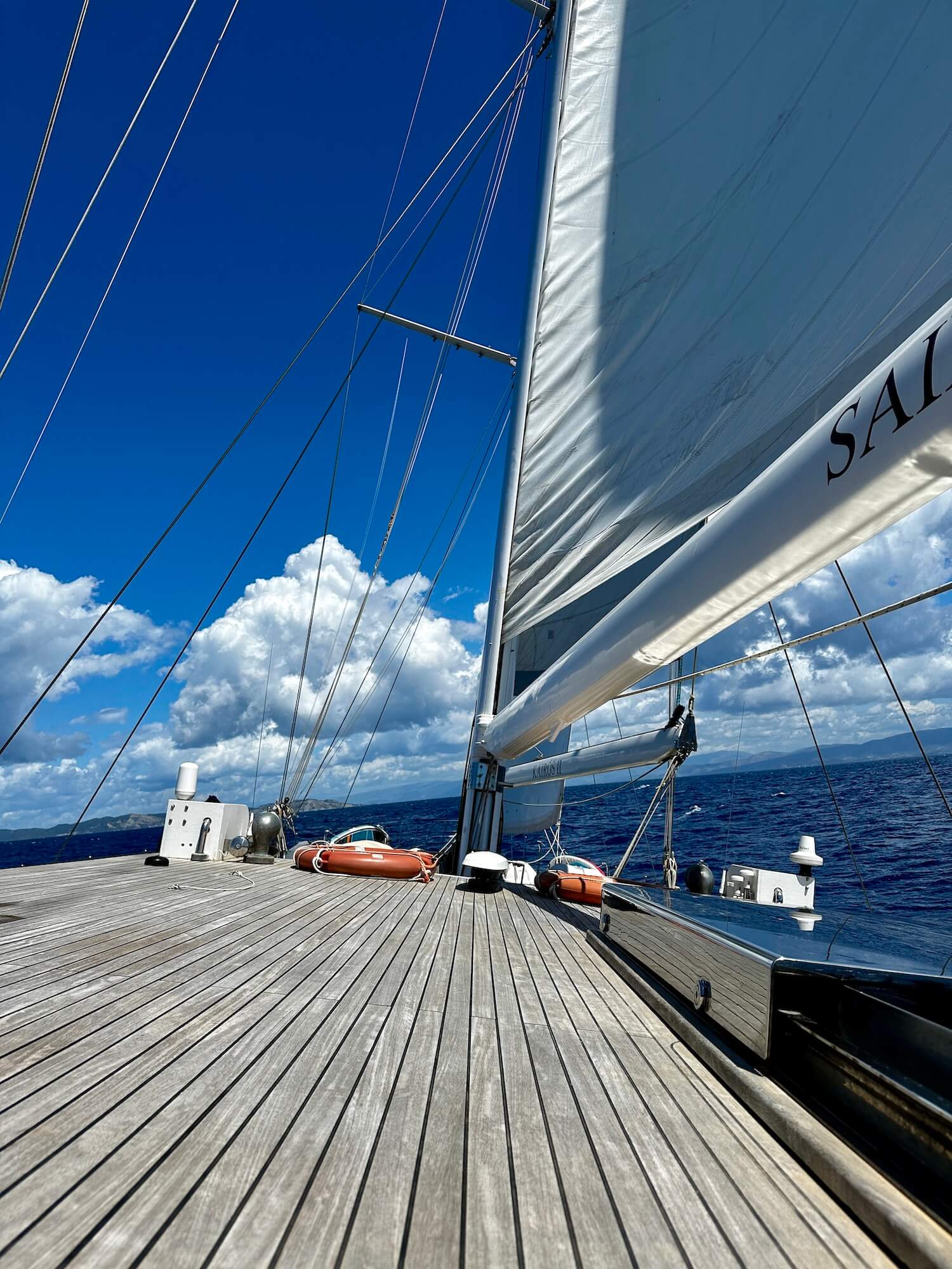 KAIRÓS tiene una superficie vélica de 600 m2 y 38 m de eslora. El nombre "KAIRÓS" procede del griego antiguo y significa aprovechar el "momento oportuno" en el momento adecuado. Con capacidad para un máximo de 16 invitados, KAIRÓS es perfecto para el alquiler del barco entero, para familias numerosas, grupos de amigos o para eventos de negocios. Si te interesan algunos datos técnicos, este barco es un Goleta de estay (goleta Bermuda) de 38 m de eslora, diseñado por Klaus Röder de Tutzing, Alemania en 2017, y construido en acero al estilo de un yate clásico en Bodrum/Turquía. Acabado en teca y caoba, amplia zona de cubierta abierta, aprox. 600 sm de superficie vélica, y cuenta 8 camarotes dobles en dos categorías.