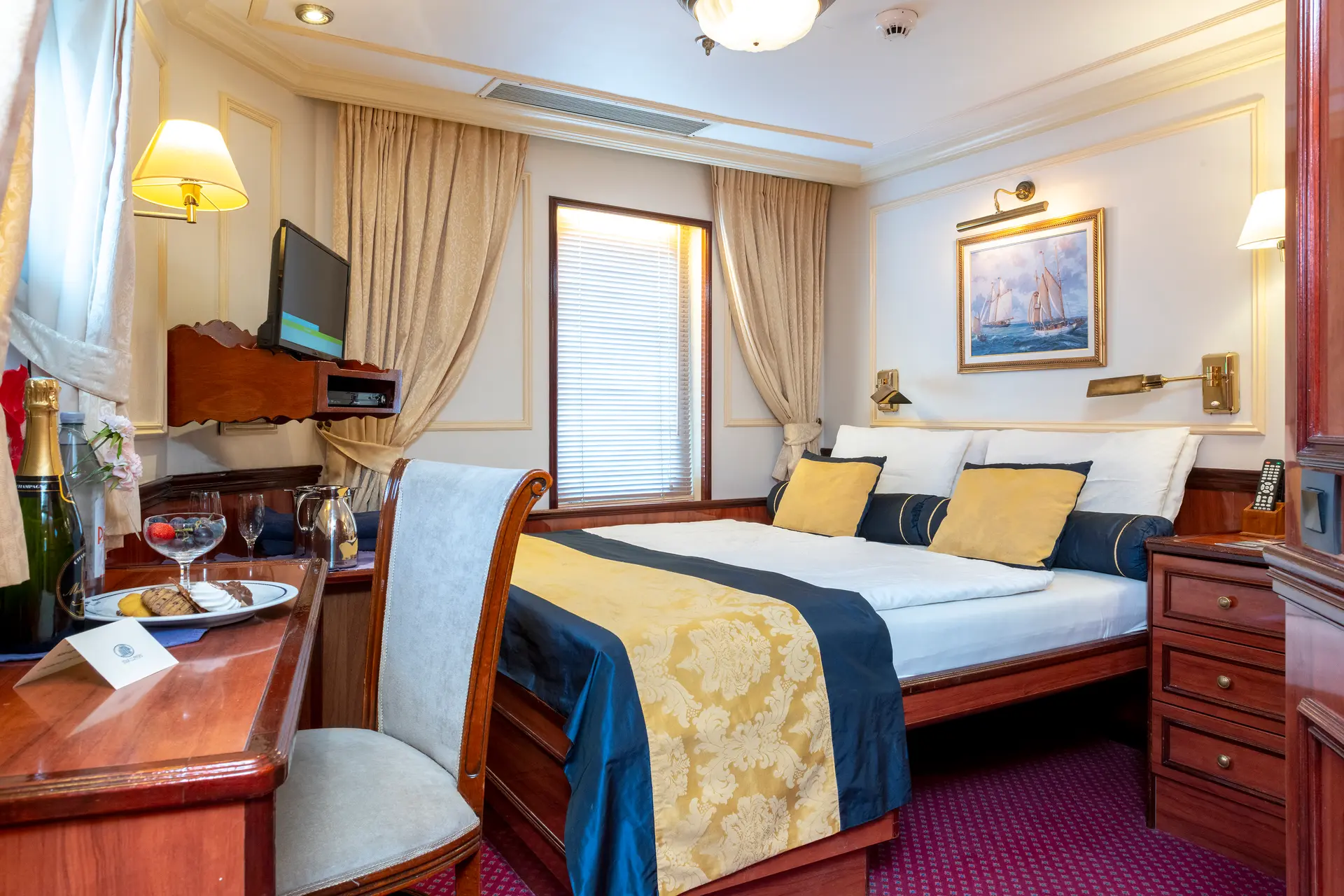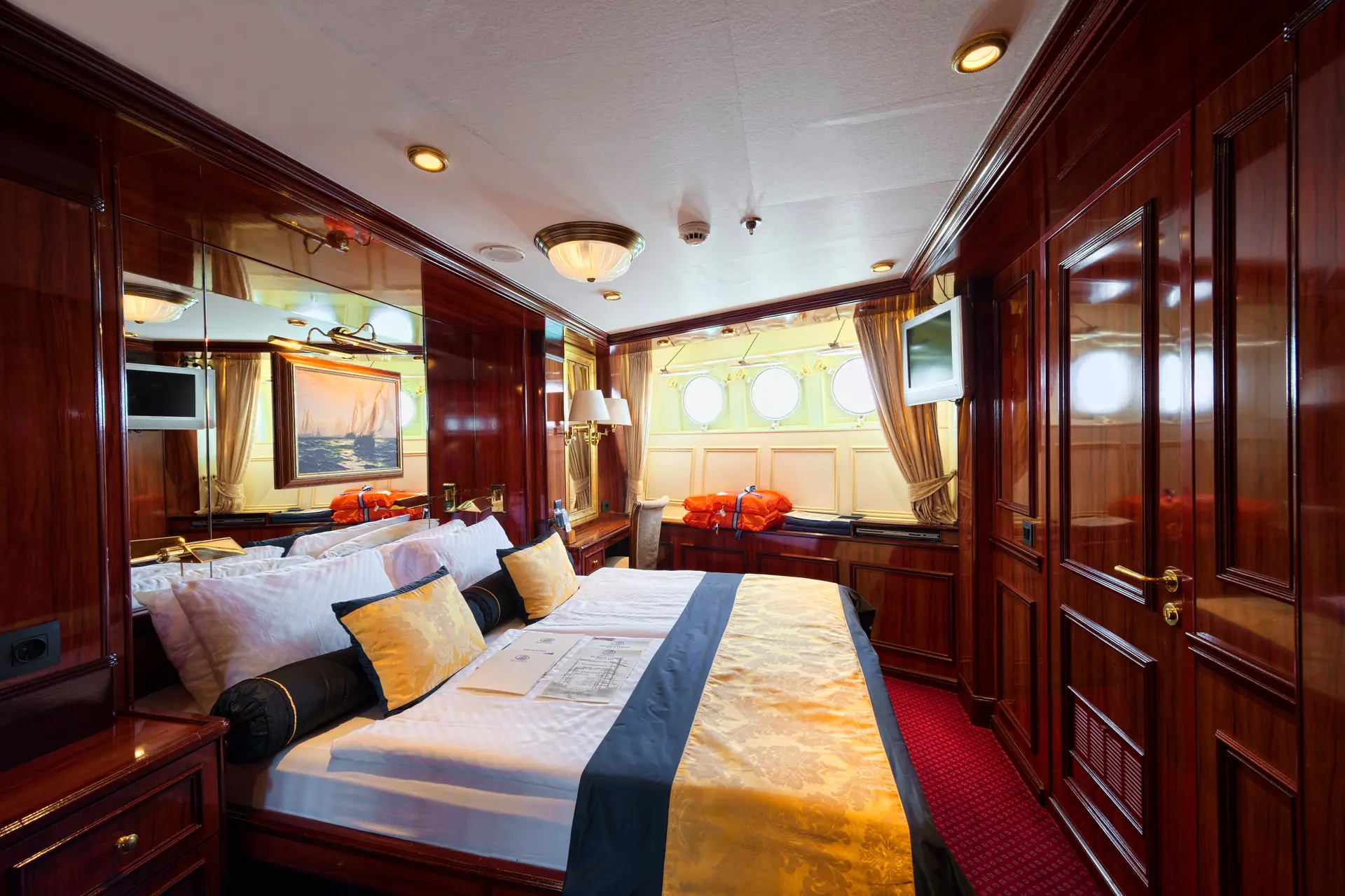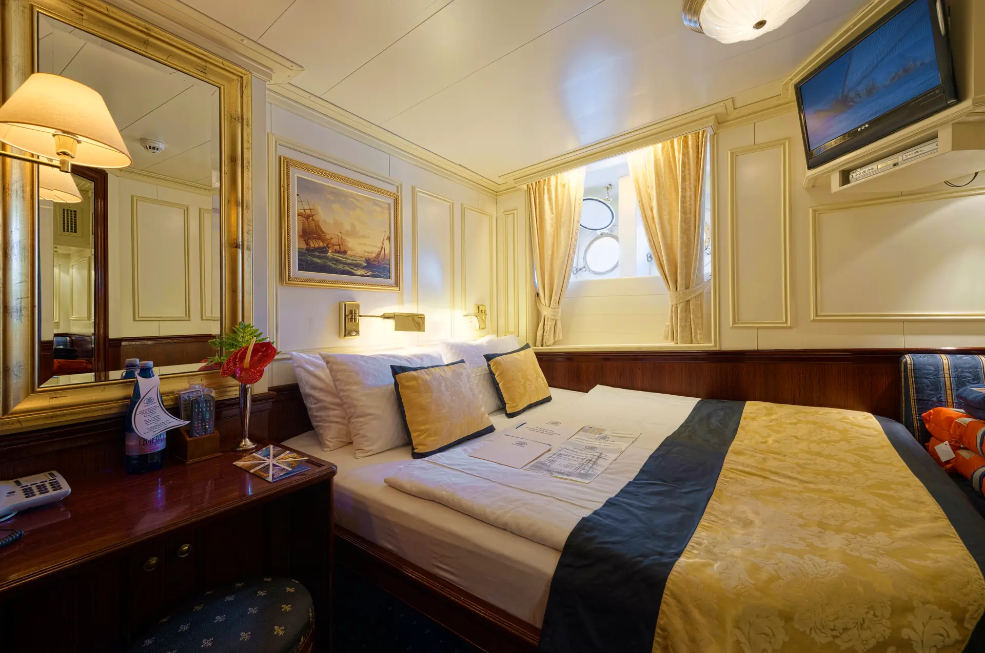Los camarotes de Categoría 5 del Royal Clipper, con unos 13 m², son perfectos para 2 adultos y un niño. Equipados con dos camas individuales que se convierten en cama doble, cuentan con baño privado con lavabo, WC y ducha. Incluyen amenities como secador de pelo, caja fuerte, aire acondicionado individual y TV vía satélite.